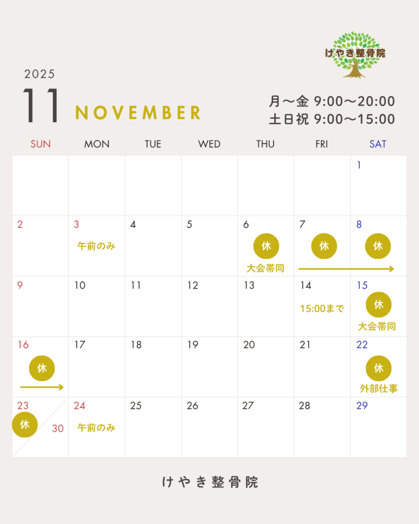 11月は大会帯同・外部仕事のため定休日が多くなっています。ご確認の上、ご予約お願いいたします。